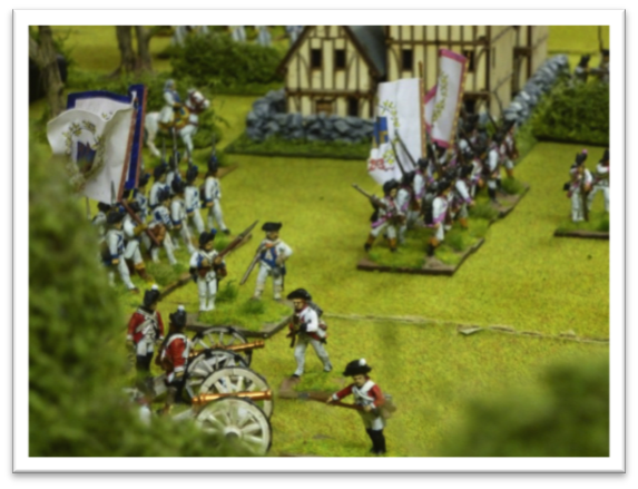 The grenadiers, hoping for support from the Yellow regiment, were taking heavy casualties as volley after volley crashed into them. The defenders of Chimay began to fire into the flank of the Feldsclosschen regiment which had advanced down the road, but was now lining the hedgerow to fire at the enemy moving up on the eastern side of the battlefield.