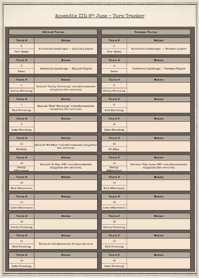 Each day is split into several turns and the scenario pack includes turn trackers for each day so players can track the games progress and make sure they bring their reinforcements on at the right time!